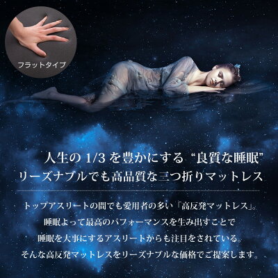 【サイズ】シングル/約95×195×10cm 【重量】約3.52 kg 【仕様】三つ折極厚タイプ 【硬さ】程よい硬さの150N 【カラー】ブラック 【素材】中材:竹炭配合高反発ウレタンフォーム カバー:伸びにくい布帛生地 【高反発なのに横寝が楽】 程よい硬さと凹凸構造で横向きに寝ても肩など身体の出っ張った部分への圧迫感が少ないです。